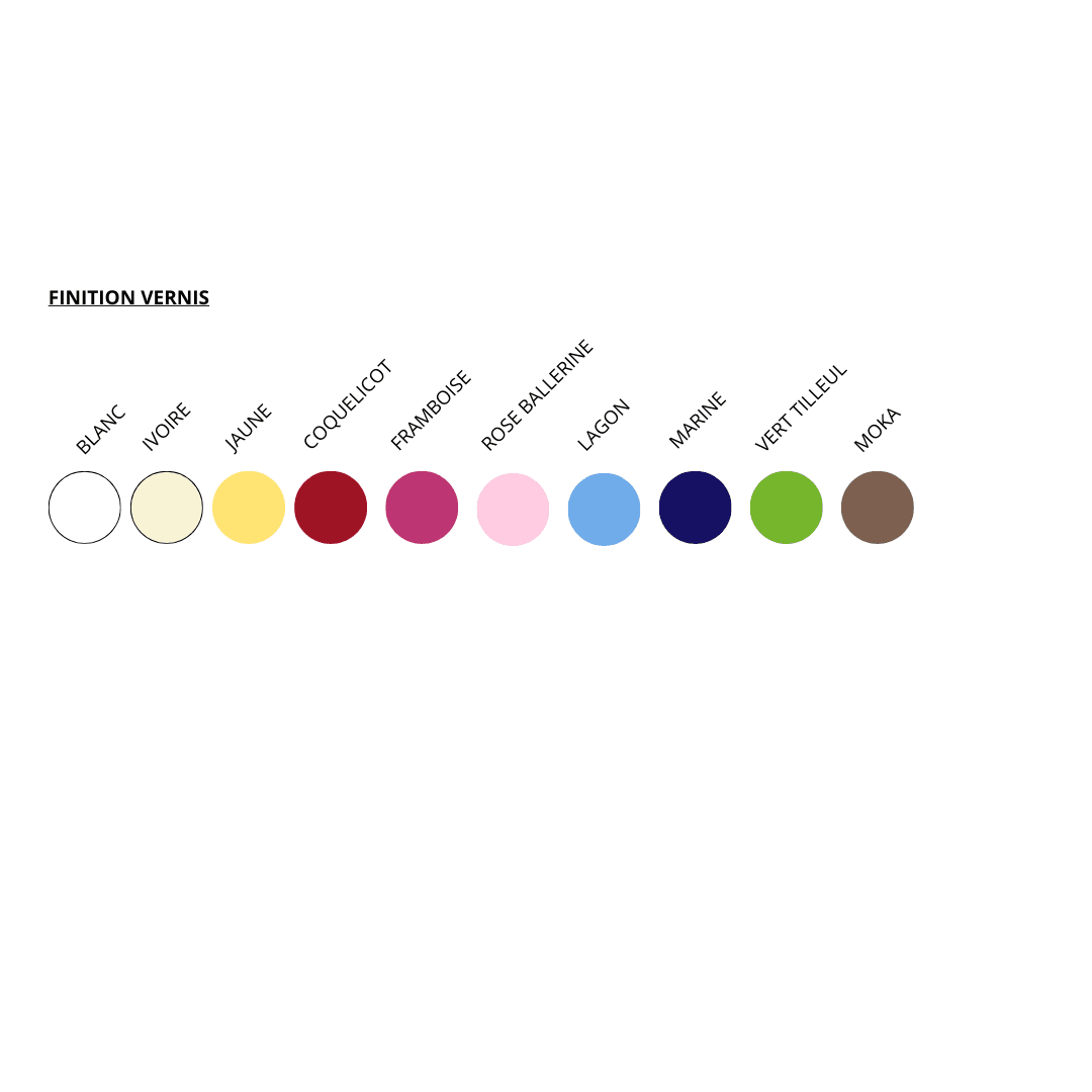 | Couleur | Assorties, Blanc , Bleu Lagon, Bleu Marine, Framboise, Ivoire, Jaune Soleil, Rose Ballerine, Vert Tilleul, Coquelicot, Moka |