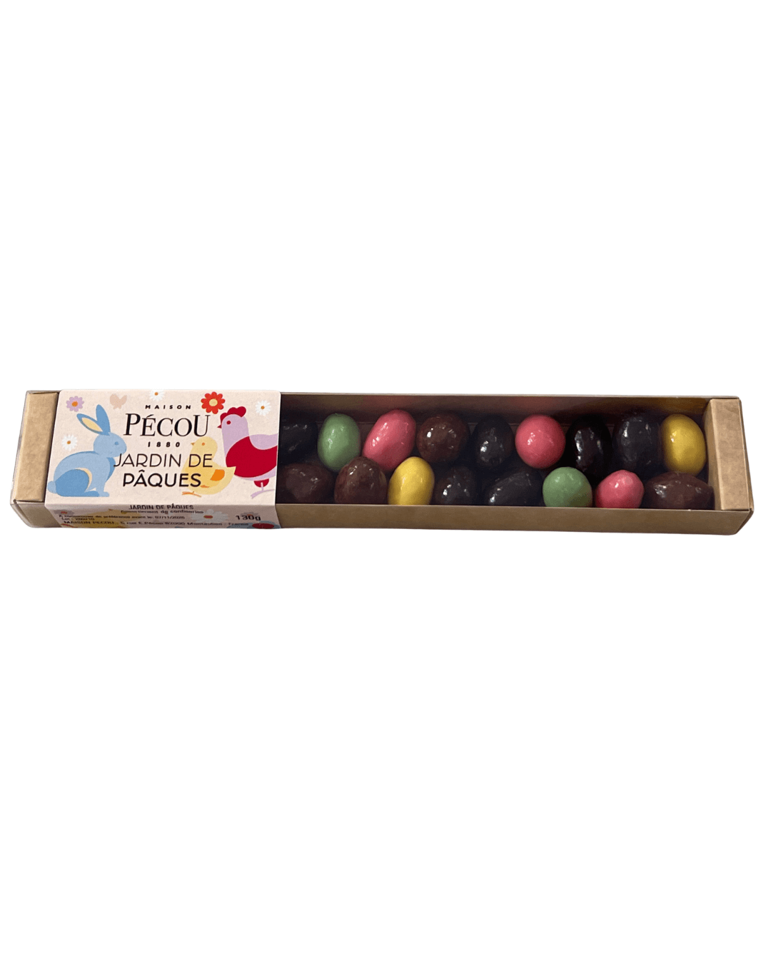 Recette Jardin de Pâques 130gr d’un assortiment de confiseries : Œufs feuilletés multi, œufs caramel chocolat noir, œufs pâtes à tartiner chocolat lait.