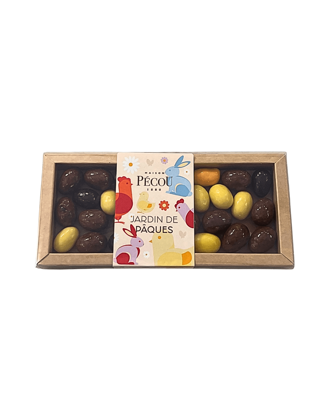 Réglette Jardin de Pâques 180gr d’un assortiment de confiseries : Œufs feuilletés multi, œufs caramel chocolat noir, œufs pâtes à tartiner chocolat lait
