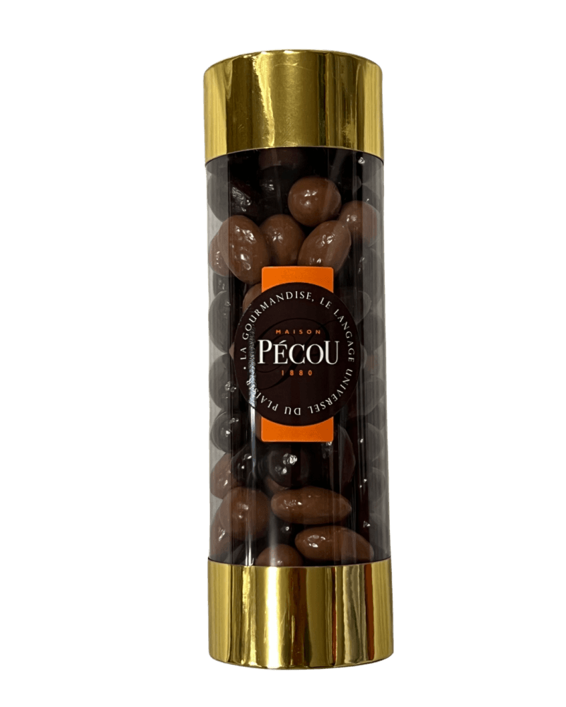 Tube transparent garnie d’un assortiment d’amandes et de noisettes grillées, enrobées de chocolat noir et lait – 320gr